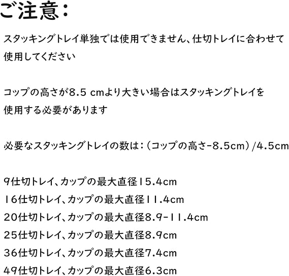 仕切り数は違いますが、トレーのサイズは同じです。49X49X10CMで、統一して使用するのに便利です