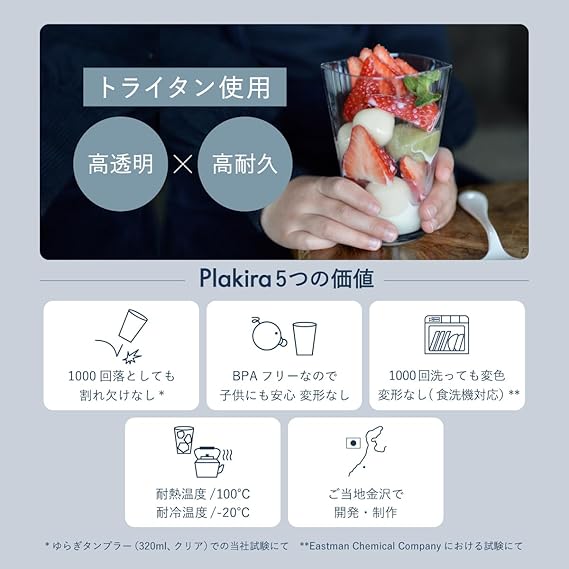 【1020回落としても割れない】永く使い続けられるプラスチック素材で作られたタンブラーです。「テーブルウェアをもっと安心で心地よく、もっと美しく、もっと便利に」で展開する日本ブランド。日本製(Made in Japan)です。耐熱、耐冷に優れた素材「トライタン」を使用しているため、ホットコーヒーだけでなく、氷を入れたコップに熱いコーヒーを注ぎ、アイスコーヒーも手軽に楽しんでいただけます。