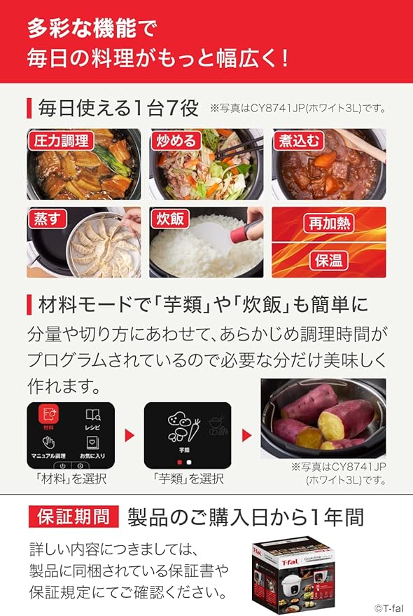 毎日使える1台7役(圧力調理、炒める、煮込む、蒸す、炊飯、保温機能、再加熱機能)