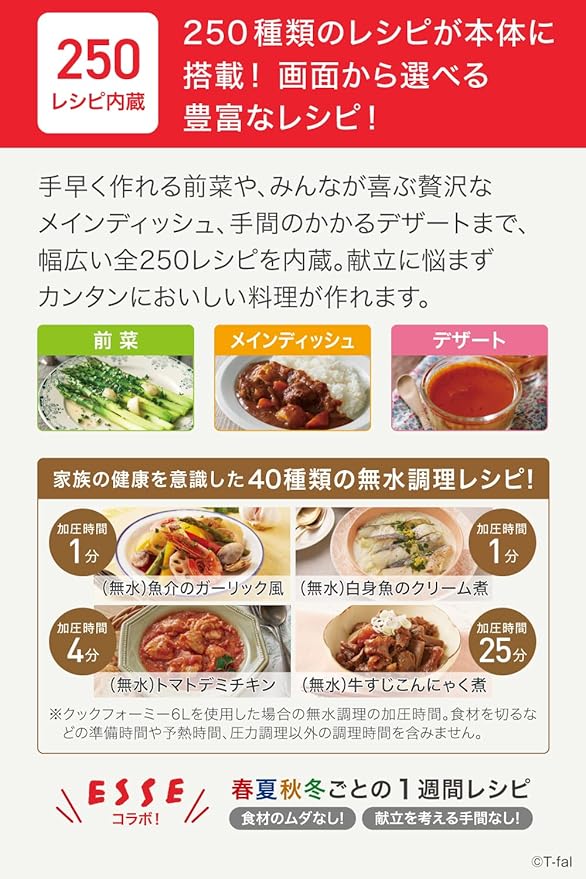 内蔵レシピ250種類(うち無水調理レシピ40種類)