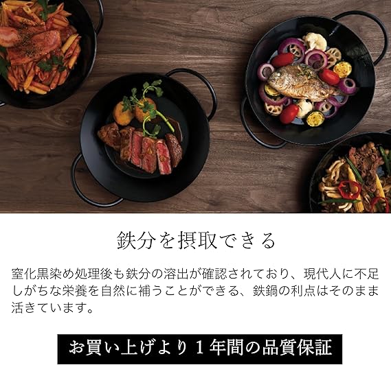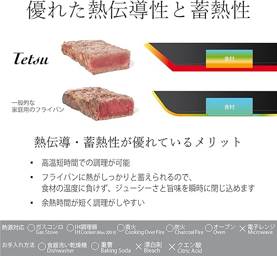 【鉄製フライパンだからこそおいしく料理!】熱伝導率が高く、美味しく仕上げる重要なポイントである、高温&短時間での調理を可能とします。肉厚のため、しっかりと鍋に熱を蓄えるので、食材の温度に負けません。熱が瞬時に伝わり、ジューシーさと旨味をとじこめるので、肉料理や卵料理等に最適です。