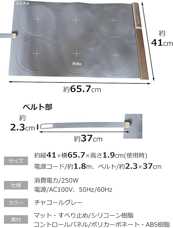 使用サイズ約40×60.5××cm重量約1465g材質・セット内容マット・すべり止め/シリコーン樹脂、コントロールパネル/ポリカーボネート電源:AC100V、50Hz/60Hz電源コード:約1.8m消費電力:250w