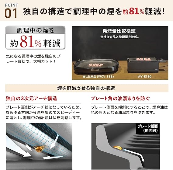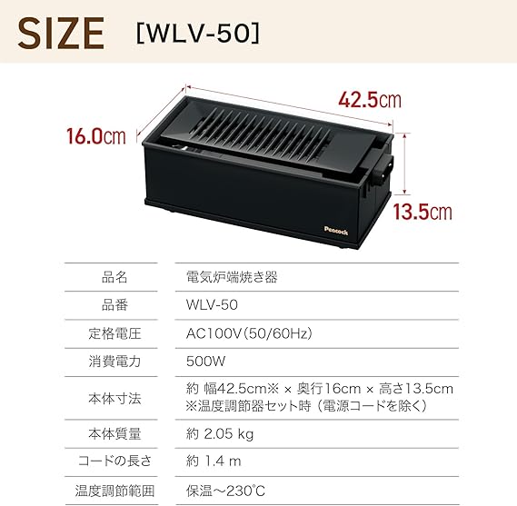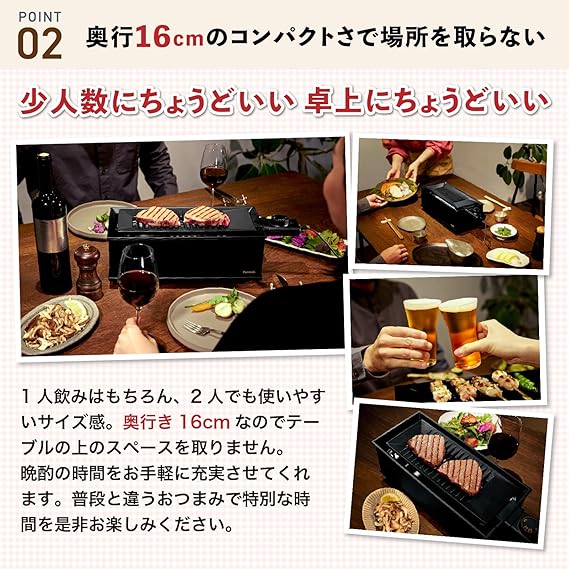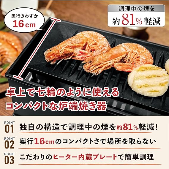 海鮮、焼き鳥や焼肉もこれ1台でいろいろ楽しめます。コンパクト設計で省スペースでも楽しめる。 穴あきプレートで、余分な油を落としながらヘルシーにいただけます。独自の3次元アーチ構造で調理中の煙を大幅カット。1人から2人飲みをオシャレに楽しめます。温度調節機能で、お料理に合わせて温度をコントロールできます。本体にプレートが置かれていない状態では、安全ロック機能が働きます。プレートはフッ素加工で焦げつきにくくお手入れがしやすくなっています。【本体サイズ(約) 】: 幅36×奥行12×高さ13.5cm【