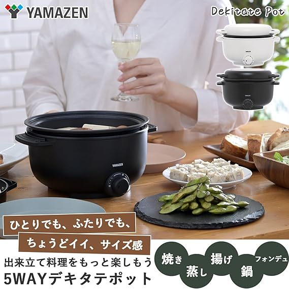 【1台5役】「焼く」「蒸す」「揚げる」「煮る」「フォンデュ」がこれ1台でできる便利な多機能グリル鍋デキタテポット。付属パーツも充実、卓上で気軽に使えて出来立ての料理が楽しめます。