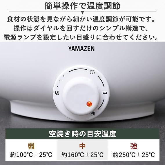 【温度調節】簡単操作のダイヤル式で温度調節が可能です。弱・中・強の目安目盛りがあり、空焼き時の目安温度は「弱」が約100℃±25℃、「中」が約160℃±25℃、「強」
