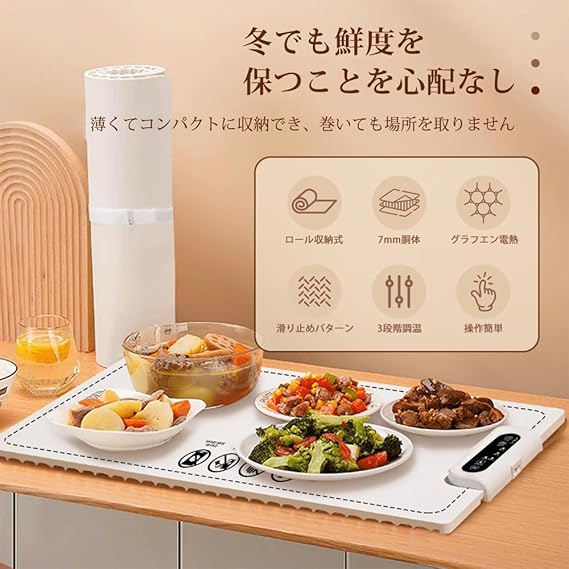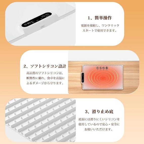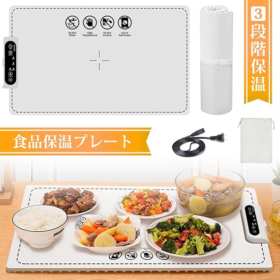 三段階温度調節:弊社のプレースマットは60℃、80℃、100℃の三段階温度調節と1時間、2時間、4時間の温度調節時間を提供します。 調理された食材が長時間ベストな状態に保たれ、食材の鮮度を保ち、美味しい食卓を演出します。