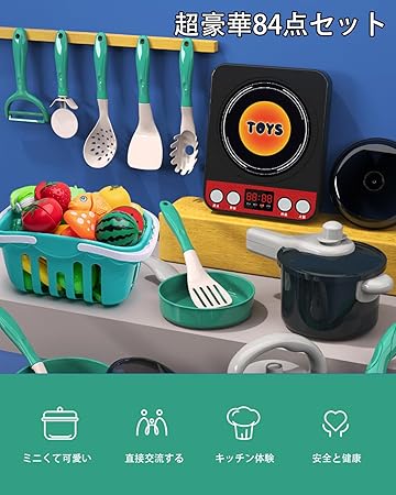 【豪華108食物のように、収納バスケット、果物、野菜、揚げた料理、調理器具、圧力鍋、お鍋、フライパン、ケットル、食パン、飲み物、などいろいろあります。日常生活やダイニングシーンを再現し!お子様に料理の楽しみを体験させて、お母さんは子供が台所に入ることを心配無し!