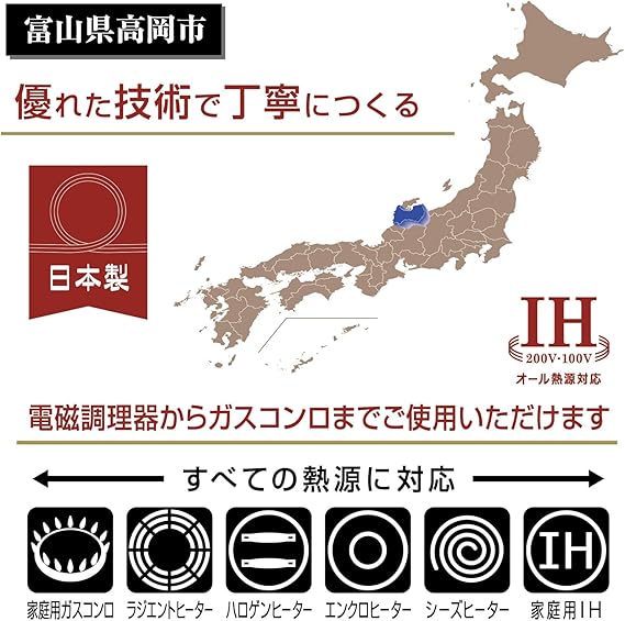 対応熱源:ガスコンロ、電磁調理器 (IH 100V・200V)、オール熱源対応