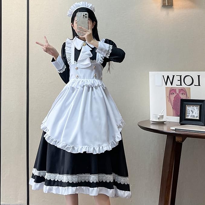 [YAISHN] メイド服 ロリータ ワンピース ゴスロリ 可愛い 正統 ドレス ロング 人気 ハロウィン 仮装 レディース コスプレ 長袖 蝶結ぶ パーティー イベント 演出服 カチューシャ ニーハイソックス 5点セット