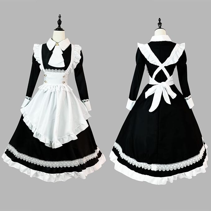 [YAISHN] メイド服 ロリータ ワンピース ゴスロリ 可愛い 正統 ドレス ロング 人気 ハロウィン 仮装 レディース コスプレ 長袖 蝶結ぶ パーティー イベント 演出服 カチューシャ ニーハイソックス 5点セット a