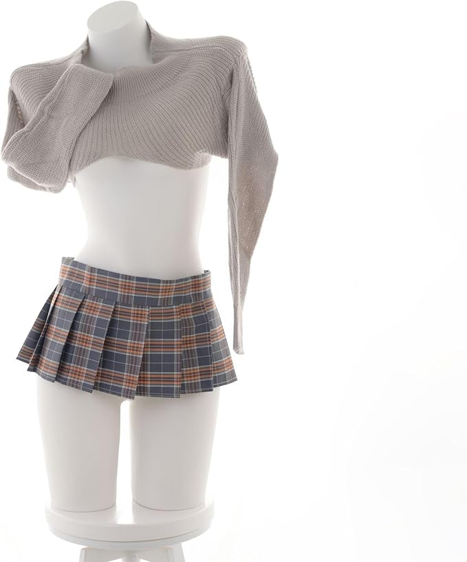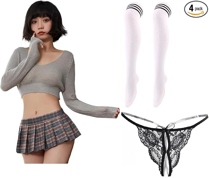 [Youngfull] 3色 4点セット セーラー服 JK コスチューム セクシー 女子高生 可愛い 制服 ニット 長袖 ミニスカート Tバック jk ニーハイソックス へそ出し エロい コスプレ プリーツスカート チェックスカート 過激 誘惑 カップル ランジェリー 下着 a