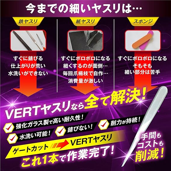 【お客様の声を聴き改良】お客様から多く寄せられた、「VERTヤスリをさらに細くして欲しい」という声をいただき改良しました。プロも満足の超極細ガラスヤスリが誕生しました。
