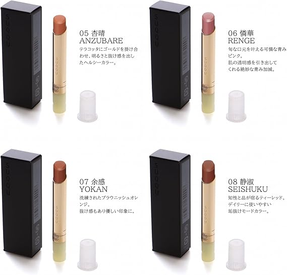01 薔薇和 -BARANAGOMI:ミルキーで黄みのあるウォームシナモン。 02 香木 -KOUBOKU:ヌーディでありながら存在感のあるローズピンク。 03 沫桜 -AWAS