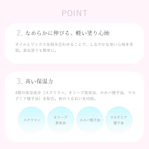 【ご使用上の注意】○唇に異常が生じていないかよく注意して使用してください。◯化粧品がお肌に合わないとき即ち次のような場合には、使用を中止してください。そのまま化粧品類の使用を続けますと、症状を悪化させることがありますの