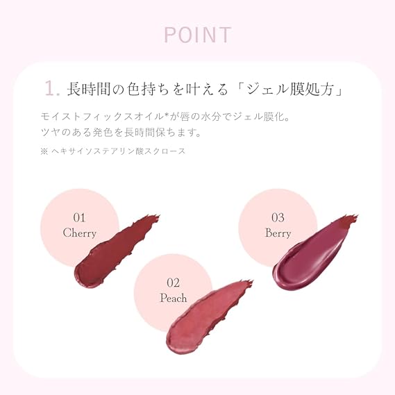 【商品について】クリーミーなツヤ&発色をキープ/甘く煮詰めた、愛されチェリー 長時間の色持ちを叶える「ジェル膜処方」。なめらかに伸びる、軽い塗り心地。うるおいたっぷりな保湿感。