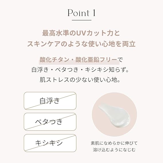 【高いUVカット力なのに白浮き知らず】紫外線吸収剤をバランスよく配合しSPF50+/PA++++を実現、紫外線散乱剤フリーでなめらかで透明感のある仕上がりで夕方までキレイな仕上がりをキープします