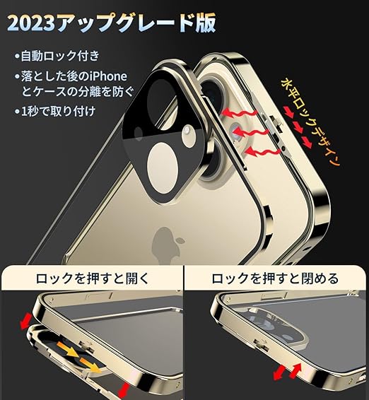 【ロック機能付き・1秒で取り付け・一体型レンズ保護付き】革新的な技術、このiPhone15 両面ケースは上部にスライドボタン式のロックがあり、前後のケースをしっかり固定します。上部のボタンを押すだけで、ロックの解除も簡単、取り付けで開く非常に便利です。こちらのあいふぉん15ケースであなたの大切なスマホを守ってあげてください!このiPhone15 ケースのバンパーとレンズ保護フィルムが一体型になっており、背面カメラ周りを覆い、カメラへの傷を防ぐ、カメラレンズ保護設計です。レンズの保護フィルムの必要