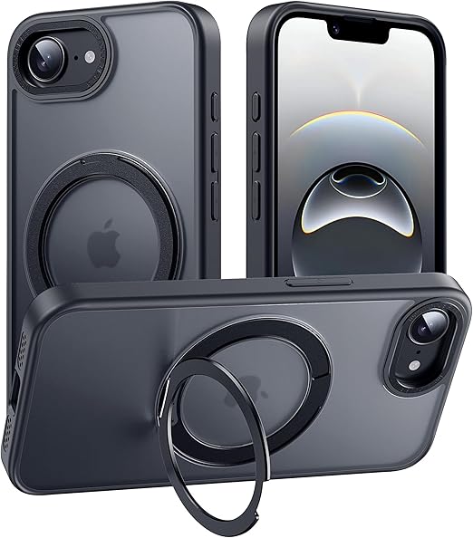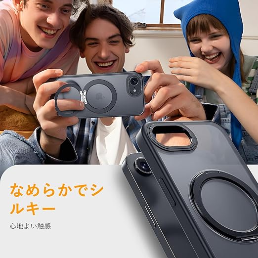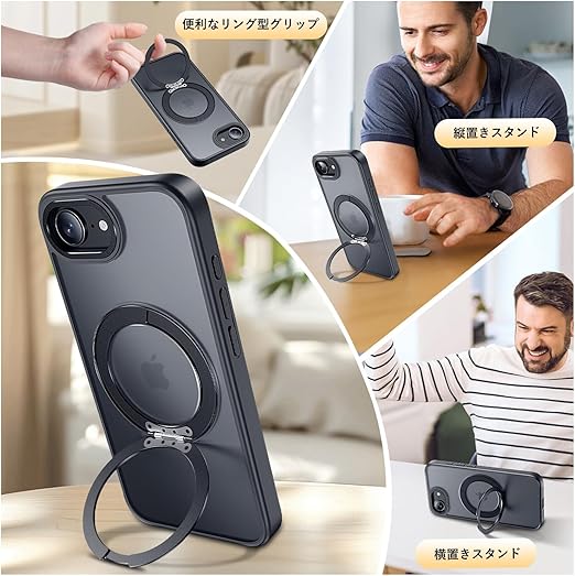 【多機能360度回転スタンド】Mcoifull iPhone 16e ケース 多角度調整 マグネットスタンド 耐衝撃 マット感 半透明 指紋防止 高安定性 リングスタンド あいふおん16eケース くろ a