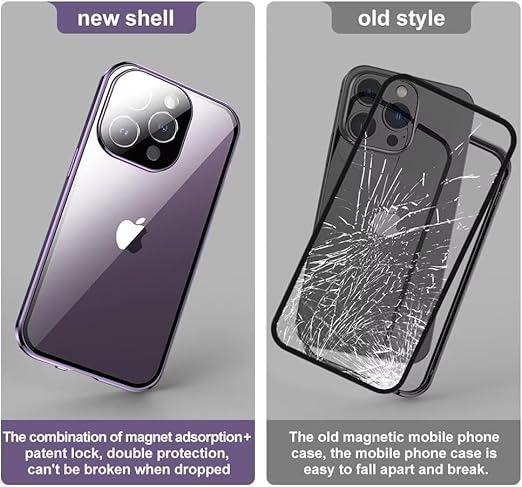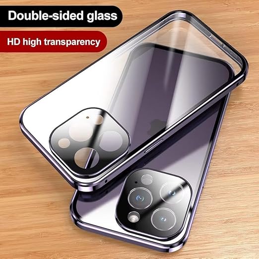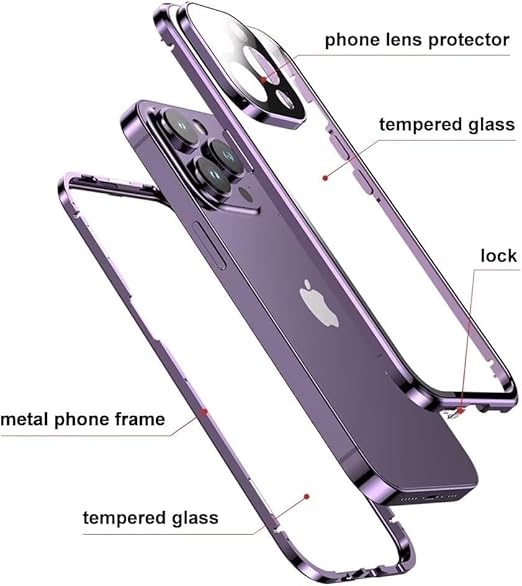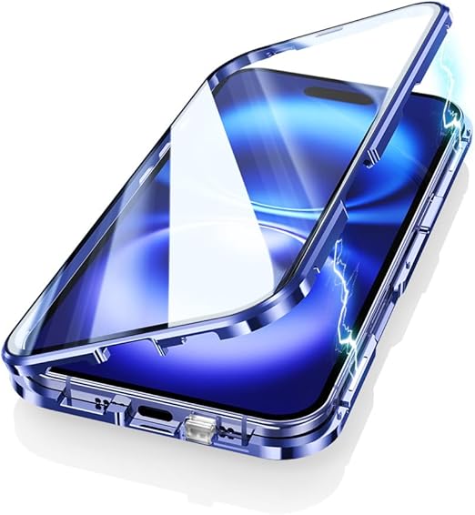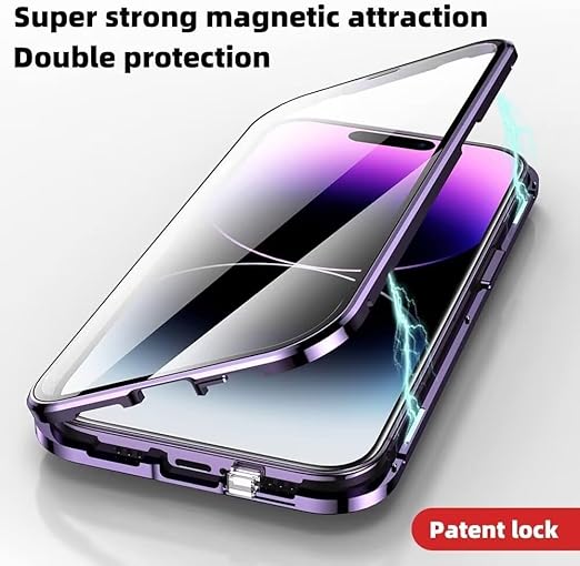 iPhone 16 用 ケース 全面カバー ロック機能付き+マグネット式 両面クリア強化ガラス 安全ロック カメラ保護 アルミバンパー アイフォン16 ガラスケース 両面ケース 透明,ブルーパープル a
