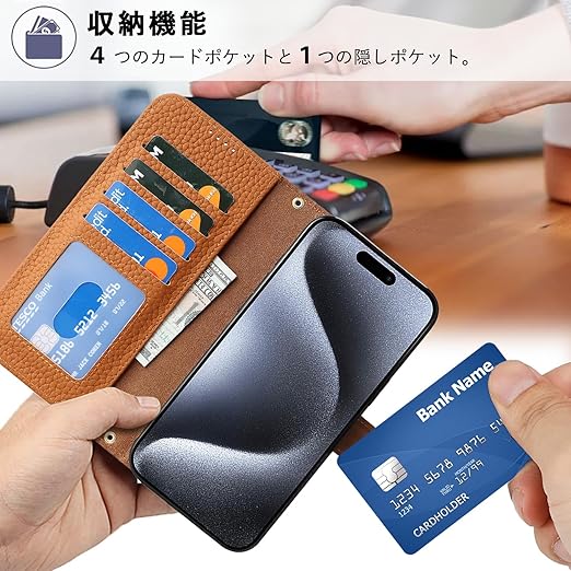 【収納機能】ケース内側には四つのカード入れとフリーポケットがつき、カード類や紙幣、名刺などが収納できます。普段の生活に便利をもたらします。