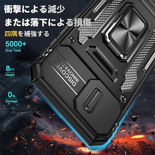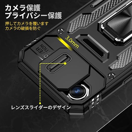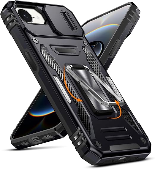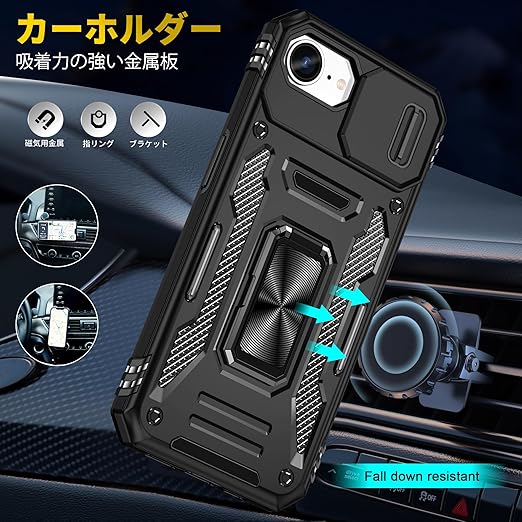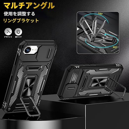 iPhone 16e 用 ケース リング 耐衝撃 車載ホルダー対応 カメラ保護 傷防止 米軍MIL規格 携帯カバー 滑り止め 指紋防止 頑丈 タンド タフ・アーマー おしゃれ TPU+PC材質 ブラック 111-IP16E-01 a