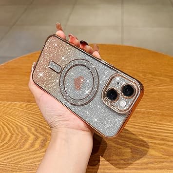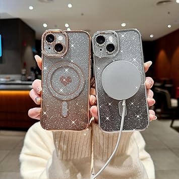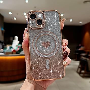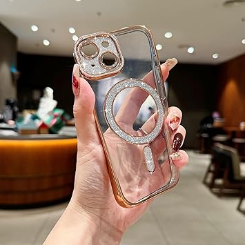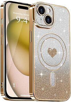 Lafunda iPhone 15用 ケース Magsafe対応 キラキラ 可愛い 女の子 人気 ブリンブリン フォンカバー スパークリング ハート 透明 メッキ加工 カメラ保護 耐衝撃 軽薄型 磁気スマホケース アイホン 15 用携帯 ゴールド a