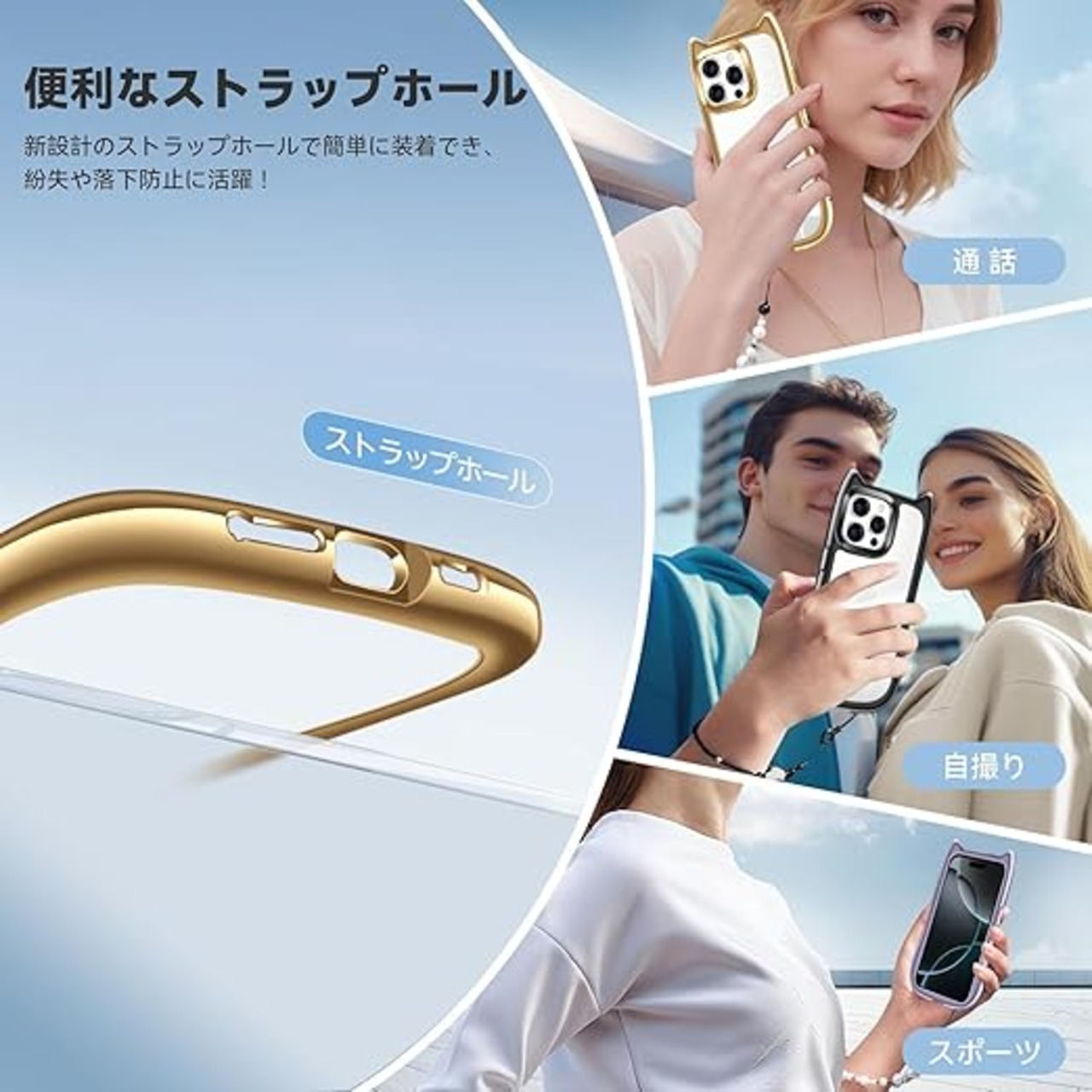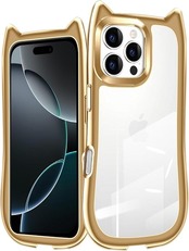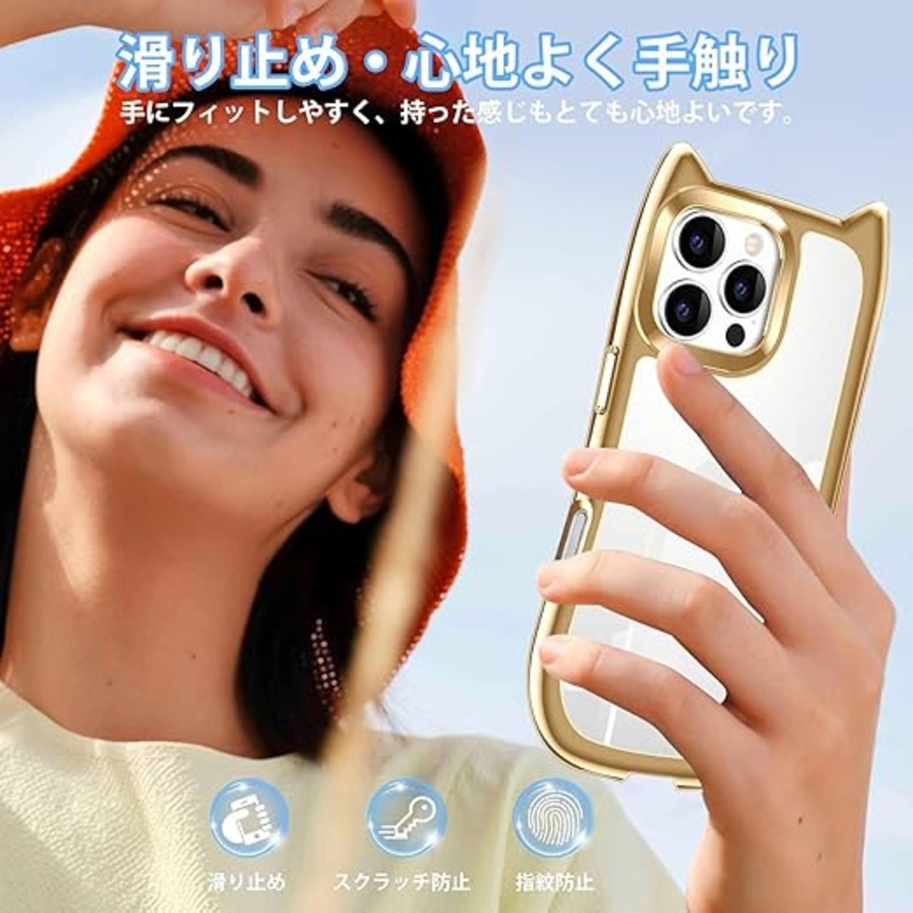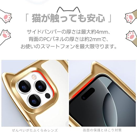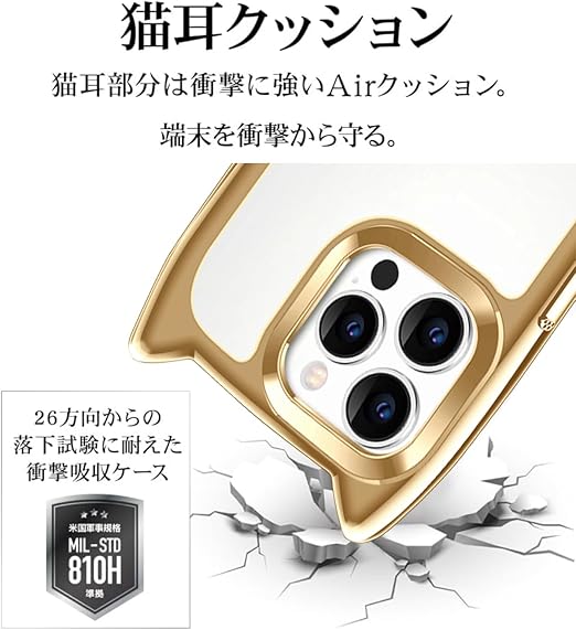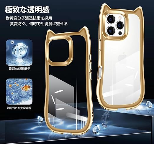 iPhone 15 Pro Max ケース クリア カバー TPU 可愛い 猫耳 ネコミミ かわいい おしゃれ ストラップホール アイフォン15プロマックス スマホケース 多機能 耐衝撃 全面保護(ゴールド) a