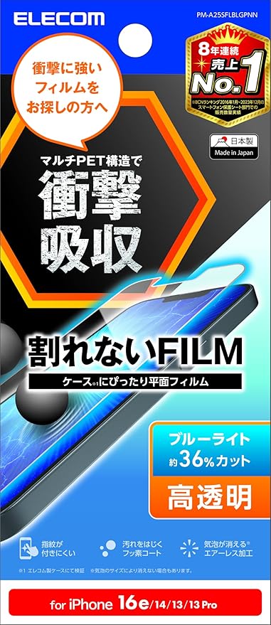 エレコム iPhone 16e / 14 / 13 /13Pro フィルム ブルーライトカット 耐衝撃 衝撃吸収 グレア 保護 指紋防止 光沢 自己吸着で貼りやすい エアーレス PM-A25SFLBLGPNN a