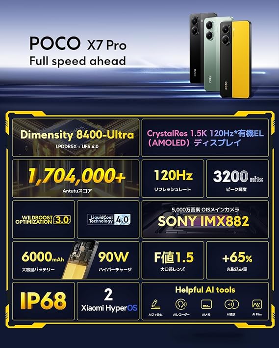 Xiaomi POCO X7 Pro 8GB+256GB 日本語版 Simフリー スマートフォン 90Wハイパーチャージ 120Hz 有機ELディスプレイ IP68防塵・防水 docomo/au/SoftBank/Rakuten Mobile 回線対応 イエロー a