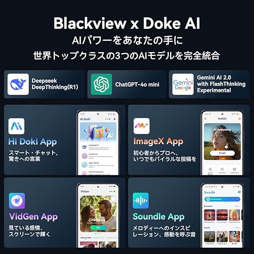 【未来が、その手に。世界トップ3のAIを完全統合】 これは単なるスマホではありません。あなたのポケットに収まる「スーパーブレイン」です。Blackview COLOR 6は、世界トップクラスの3大AIモデル、ChatGPT、Gemini、Deepseekを革命的に完全統合しました 。メールの作成、プレゼン資料の構成、プログラミング、旅行計画まで、一言伝えるだけでAIが最適な答えとアイデアを提供。あなたの仕事と学習の効率を劇的に向上させ、未来をリードする力となります。