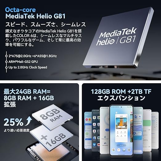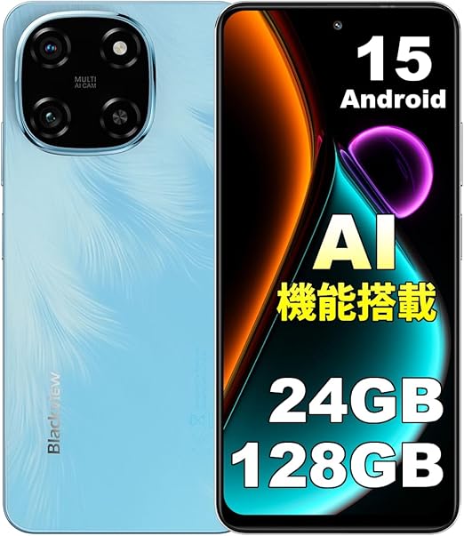 Blackview COLOR 6 スマートフォン本体 SIMフリー|AI機能搭載|Android 15 スマホ|24GB+128GB (2TB拡張可能)|6.67インチ大画面|50MP カメラ|5000mAhバッテリー+18W急速充電|顔認証+指紋|4G デュアルSIM|OTG/GPS b