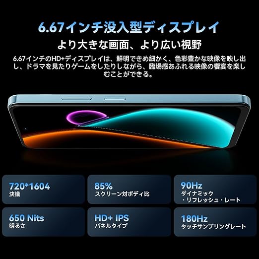 【HD+ 6.67インチ大画面|700nit高輝度ディスプレイ】 大画面HD+ IPSディスプレイ(85%の画面占有率)
