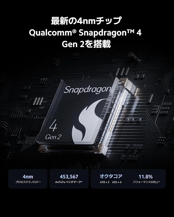 【最新の4nm製造プロセス5Gチップ搭載】最新の4nm製造プロセス5Gチップ、Qualcomm Snapdradon 4 Gen 2を搭載。省電力かつミドルクラス並みの高いパフォーマンスによる快適な操作感、ゲーム体験を提供します。LPDDR4X と UFS 2.2の強力な組み合わせにより、ゲームの読み込み、アプリの起動、画像の読み込みの速度が大幅に向上し、よりスムーズな操作性を可能にします。