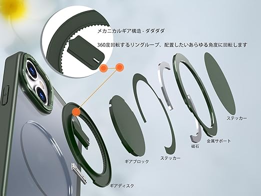 【捻れば最適な角度】精密な機械工学により、捻るたびに機械式腕時計の巻き上げのようなカチッとした音と感触を生む。角度安定。仕事中は情報確認やビデオ会議、通勤時の情報チェック可。リングとしても使用可。"プライベート"は息抜きではなく、視野を変える時。映像やゲーム、写真やSNSチェック、家族との連絡など、多彩なシーンで活躍!(iphone 13 ケース/iphone 14 ケース)