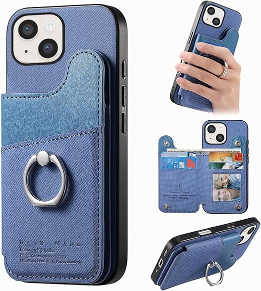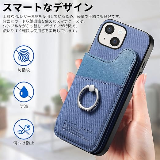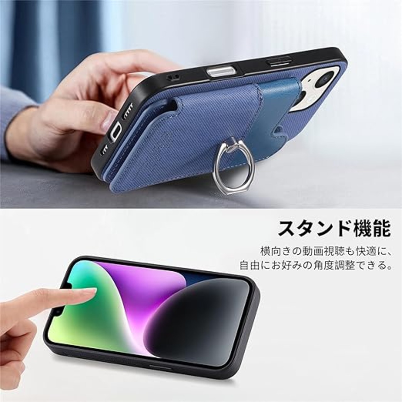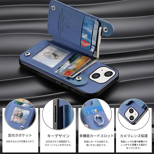 iPhone 14 / iPhone 13 ケース 手帳型 リング付き アイフォン 13 / 14 スマホケース iphone 14 手帳型ケース 耐衝撃 背面 カード収納 あいふおん14ケース いphone14 カバー PUレザー 薄型 いphone13 スマホカバー 財布付き カメラ保護 スタンド機能 RFIDブロッキング 360°回転 スナップボタン TPU 軽量 おしゃれ ブルー a