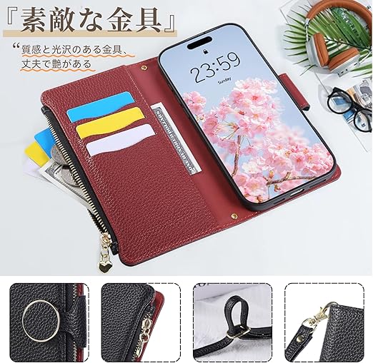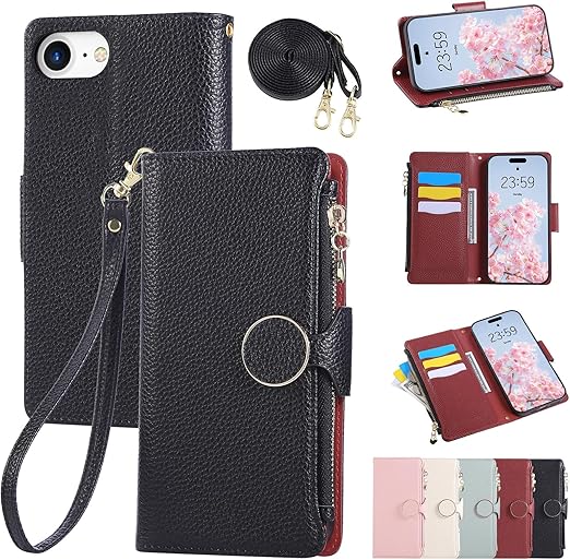 Rosbtib iPhone se ケース 手帳型 第2/3世代 ショルダー 財布型カバー iPhone se2 iPhone se3 ケース 手帳型 おしゃれ ファスナー型 小銭入れ カード収納 iPhone 8/7 カバー 手首/肩掛けストラップ付 マグネット式 スタンド機能 アイフォンse スマホケース se iphoneケース 可愛い シンプル 女性 人気 肌触り良い 全面保護(ブラック) a