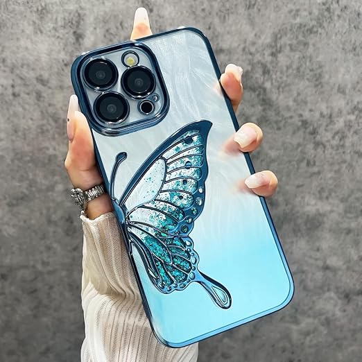 KoduneesanX iPhone14 ケース 対応 カバー かわいい 3D 蝶 蝶柄 キラキラ りゅうしゃ ぴかぴか光る 人気 韓国 iPhoneケース お洒落 おしゃれ アニメ 可愛い 蝶模様 光沢 フラッシュ紙片 TPU シェル 携?ケース ?(iPhone 14,#1 青) a