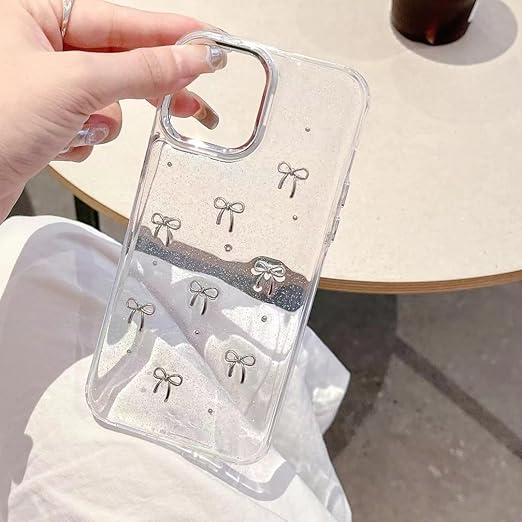 【3D ミニリボン デザイン 】背面はシルバーの小さなリボンと、埋め込まれている目を引くグリッターが剥がれ落ちたりしなく、可愛い、流行りの韓国デザインです!カメラ周りのシルバーフレームは、取り外し可能なデザインとなっております、お好みに合わせて、シルバーフレームの有無ご利用くださいませ。