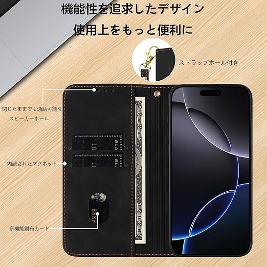 【便利性アップと収納性アップ】手帳型との同色のストラップ付き、不便な時、片手でストラップで上手に使え、横置きスタンド機能付いて、ケースの背面から折