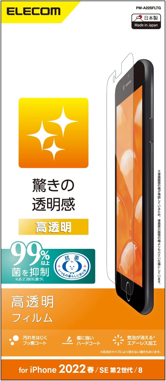 iPhone SE 第2世代/第3世代、iPhone 8、iPhone 7、iPhone 6s、iPhone 6の液晶画面をキズや汚れから守る、高透明タイプの液晶保護フィルムです。