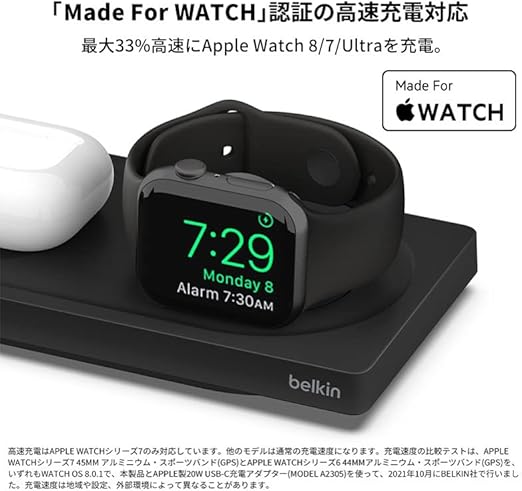 Belkin[Apple公認] 3 in 1 MagSafe充電器 最大15W高速充電 ワイヤレス充電器 MagSafe公式認証 iPhone 16 / 15 / 14 / 13 / 12 Apple Watch 8/7/Ultra 高速充電対応 AirPodsワイヤレス充電対応 ブラック WIZ016dqBK a