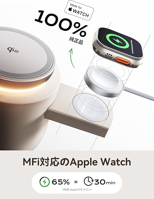 【MFi認証済み & Apple Watch対応】Apple公式認証取得済み iPhone 16/15/14/13/12/11/X/8、iPad、iPod、Apple Watchと完全互換性を保証。Apple正規認証であるMade for Apple Watchも取得. iOSアップデート後も警告表示なしで安定動作!Apple認証チップと高品質素材採用で過熱/短絡/機器損傷を防止。非認証充電器比最大3倍の高速充電を実現。非認証品と異なり100%バッテリー健康保護を維持し、システムアップデート起因