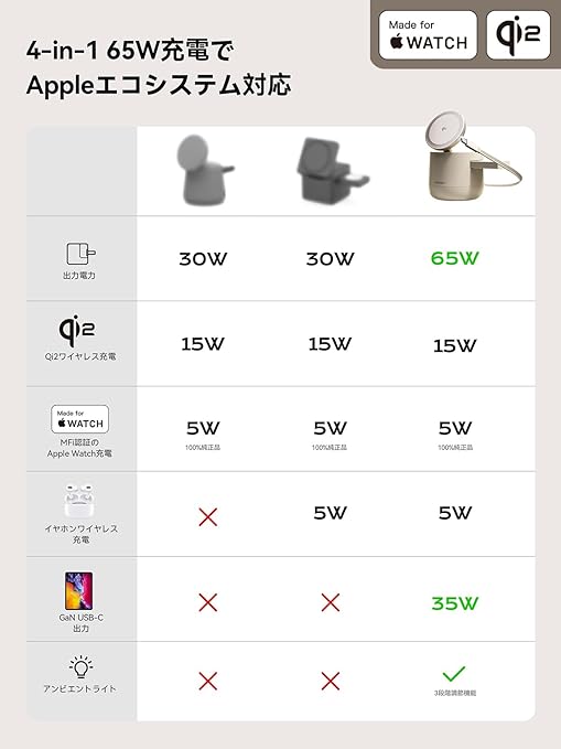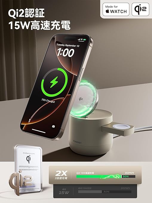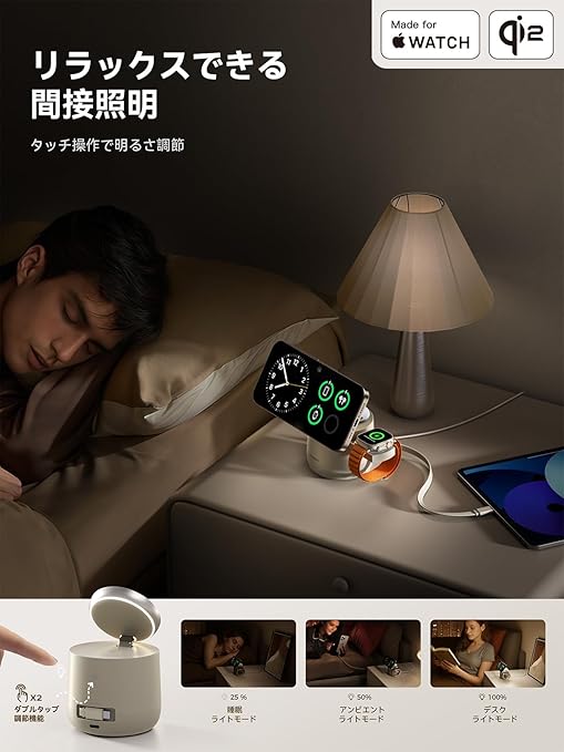 Threekey【Apple公認・MFi・Qi2・PSE公式認定】4in1 MagSafe対応 15W ワイヤレス充電器|iPhone 16/15/14/13/12・Apple Watch・AirPods・iPad対応|環境光付きドック型ステーション|65Wアダプター&1.5m編み込みケーブル付属 a