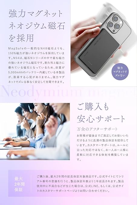 【世界最薄6.9mm】5000mAh容量を持ちながら、わずか6.9mmの極薄デザインを実現しました。驚くほど薄い設計にこだわり、充電時の装着感を極限まで抑えることを目指しました。前面と背面には耐久性の高いガラスパネルを使用し、スマートでスタイリッシュな外観とともに驚異的な薄さを両立。ワイヤレス充電対応の5000mAhモバイルバッテリーの中でも、世界最薄の薄さを実現しました。