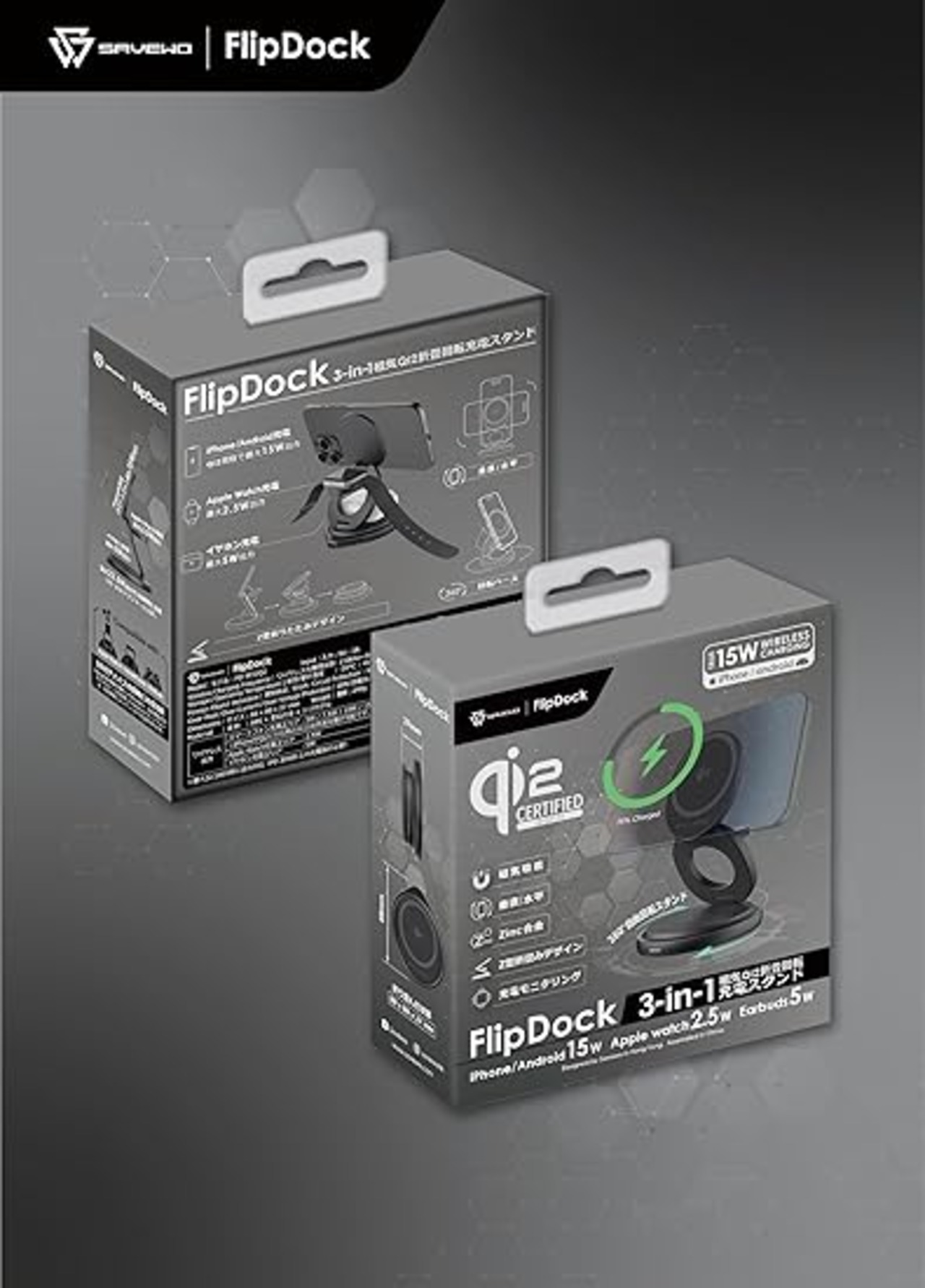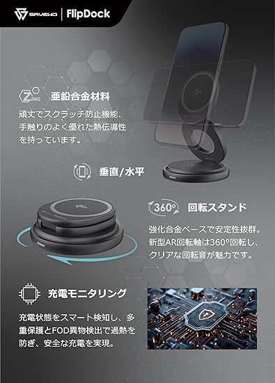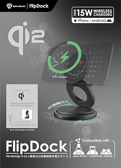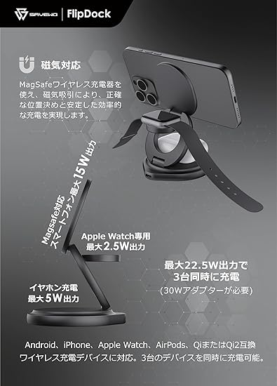 SAVEWO【Qi2認証・15W急速充電対応】FlipDock 3-in-1 ワイヤレス充電スタンド 折り畳み式 回転式 磁気充電器 3台同時充電 iPhone 16/15/14/13/12 seris/Galaxy S20/S10/S10+/S9/Airpods 2/3/pro/Apple Watch 各種対応 MagSafe対応 持ち運び便利 卓上スタンド (ブラック) a