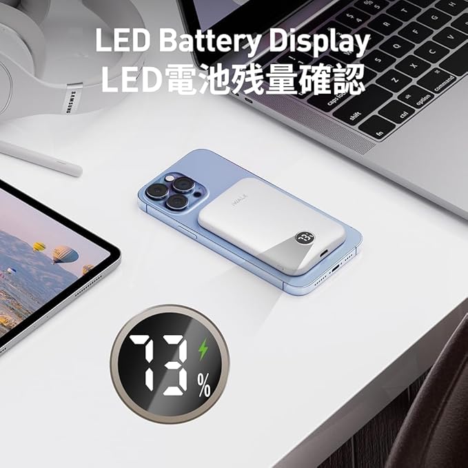 iWALK 超薄型 モバイルバッテリー MagSafe対応 マグネット式 ワイヤレス充電器 5000mAh コンパクト 軽量 持ち運び もばじゅう 小型 タイプc USB-Cポート& LEDディスプレイ PSE技術基準適合 iPhone 16/15/14/13/12シリーズ対応 旅行/出張/災害用 機内持ち込み可 ホワイト a