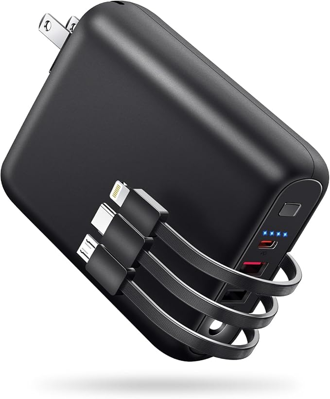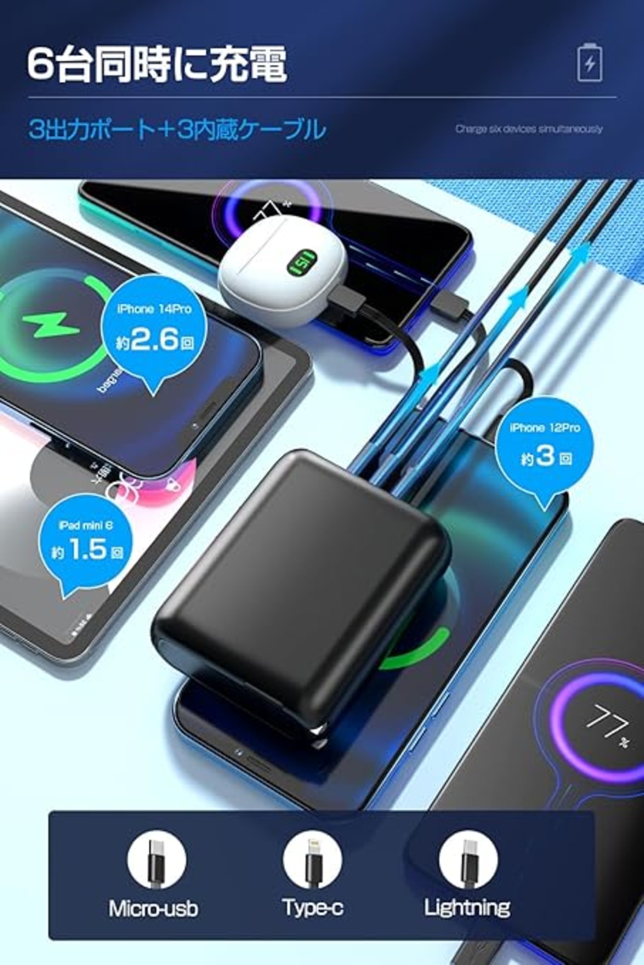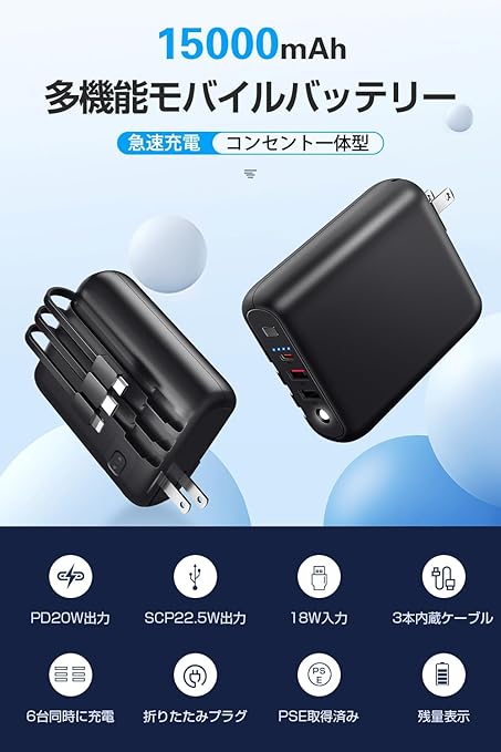 モバイルバッテリー 大容量 【15000mAh大容量・3本ケーブル内蔵・6台同時充電】急速充電 22.5W/PD20W対応 軽量 小型 バッテリー コンセント一体型 スマホ充電器 携帯充電器 Type-C入出力兼用 USB出力ポート 折りたたみ式プラグ ACアダプター iPhone/Android/iPadに適合する LEDライト付き 機内持込可能 PSE認証済 a