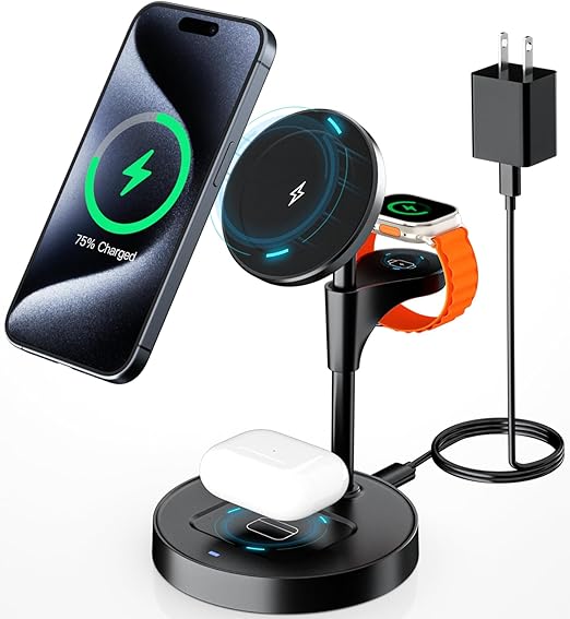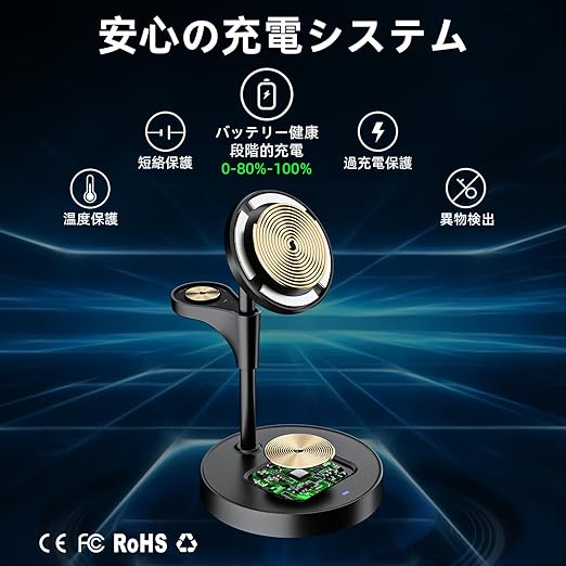 【2025新登場】3in1 ワイヤレス充電器 Apple Watch 充電スタンド対応 Magsafe 急速充電 15W/10W/7.5W iPhone/Watch/ワイヤレスイヤホン同時充電対応 iPhone 16/15/14 対応 Apple Watch Ultra 2/8/7/6/SE/5/4 AirPods 3/2/Pro対応 テレワーク用品 寝室用 オフィス用 (ブラック) a