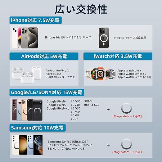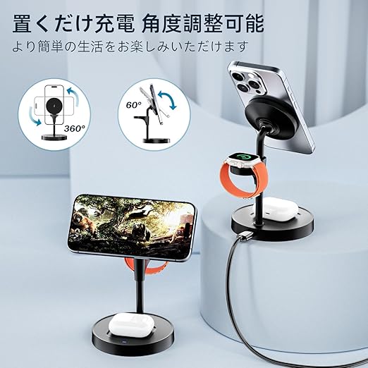 【広範な互換性】iPhone 16/15/14/13/12シリーズ対応、Apple Watch Ultra 2/8/7/6/SE/5/4対応、AirPods 3/2/Proに対応。複数のデバイスを同時に充電できるため、効率的で便利です。台座のワイヤレス充電器はワイヤレスイヤホン3/2/Pro、ワイヤレス充電対応のスマホと互換性があります。ご注意:台座でのワイヤレス充電器の最大出力は5wです。
