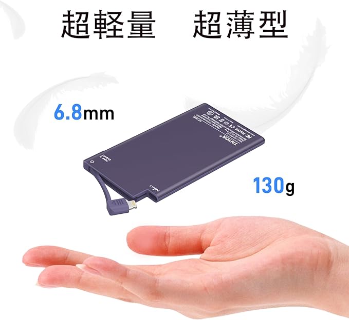超薄型、軽量モバイルバッテリー:クレジットカード6枚分の厚さしかありません。高品質スチール素材を採用し、薄くて持ちやすいモバイルバッテリーです。軽いだけでなくとても薄いので、スマホと一緒に持って操作してもほとんどストレスにもならないです。財布やポケット、カバンに入れてもかさばりません。